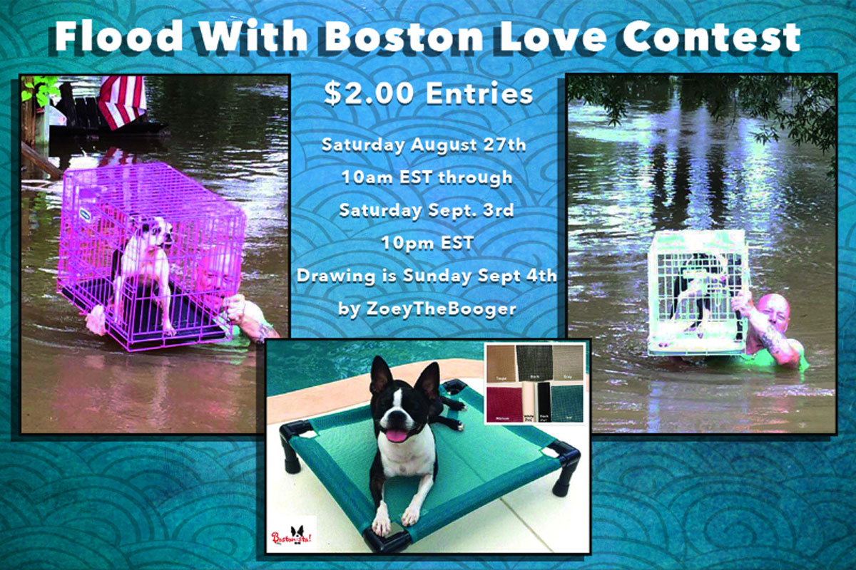 Please meet Bacchus and Trixie, two survivors of the Louisiana flood, their family has lost everything. This contest is in their honor and 100% of funds will go to their family. Grand Prize is a MEDIUM BOSTONISTA BED! Entries are only $2.00. You can purchase as many as you’d like.